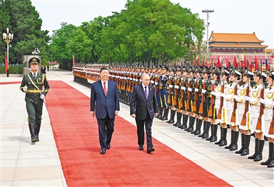 5月16日上午,国家主席习近平在北京人民大会堂同来华进行国事访问的俄罗斯总统普京举行会谈。这是会谈前,习近平在人民大会堂东门外广场为普京举行隆重欢迎仪式。