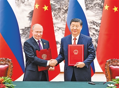 5月16日上午,国家主席习近平在北京人民大会堂同来华进行国事访问的俄罗斯总统普京举行会谈。这是会谈后,两国元首共同签署并发表《中华人民共和国和俄罗斯联邦在两国建交75周年之际关于深化新时代全面战略协作伙伴关系的联合声明》。 |