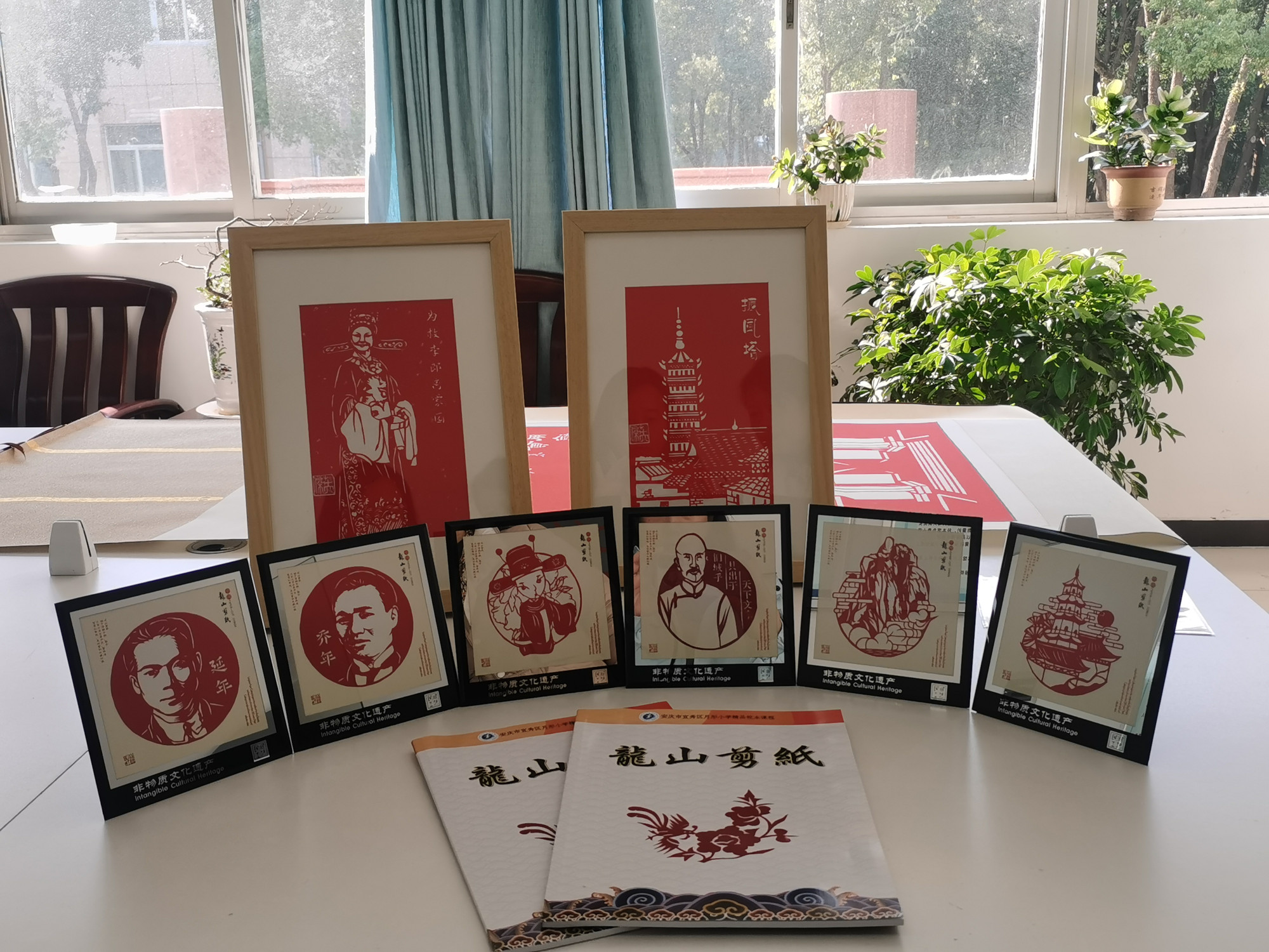 曹英杰捐赠的剪纸作品《振风塔》《此地宜城》《延乔兄弟》《为救李郞离家园》和《龙山剪纸》教学资料